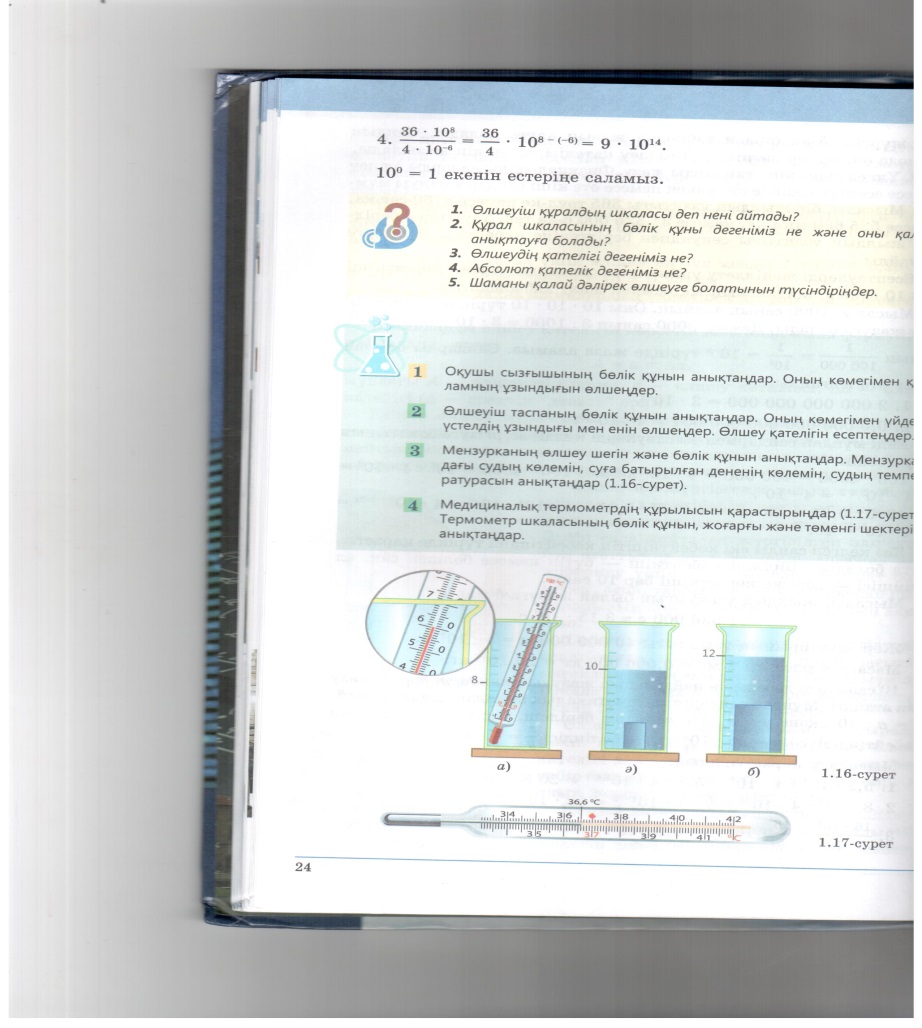 § 4 – ты зерделеу кезінде алған білімді пайдаланып, мензурка шкаласының бөлік құнын анықтаңдар.