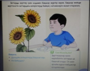 Қолдарында ғы смайликтерді көтеру арқылы көңіл күйін көрсетеді Сұрақтарға жауап береді Топтастыру жасайды Диаграмма арқылы суреттерді жанды және жансыз табиғатқа бөледі Өсімдік топтарымен танысады Сурет салады Жаттығу жасайды Оқушылар үшбұрыш, дөңгелек, төртбұрыш белгілерін өсімдік түрлері бойынша қойып шығады. Ш ш 2. Өсімдіктің даму ретін белгілеп көрсетеді Өсімдік бөліктерін анықтайды Сыныптағы парта мен гүлді салыстырады, айырмашылығын айтады Кері байланыс жасайды |