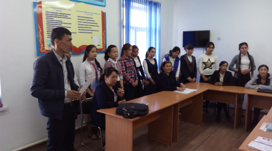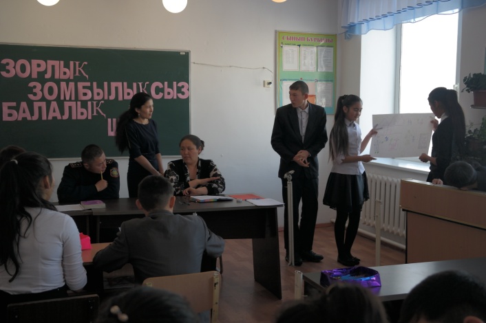«Кәмелеттік жасқа толмағандар арасындағы қылмыспен құқық бұзушылықтың алдын алу» лекция 6-9 сыныптар арасында ауылдың учасковиы М.Қалкулов қатысуымен,тренинг өткізілді оқушыларды топқа отырғызып сәлемдесу тәсілін өткізілді,тәрбие ісінің меңгерушісі Б.Жаназаров баяндама оқыды «Зорлық зомбылықсыз балалық шақ» тақырыбында.Психолог топтағы оқушыларға зорлық зомбылықсыз балалық шақ дегенді қалай түсінесіңдер соны ақ қағазға салып оны қорғады.Үш топтағы оқушыларда бір бірінен жарыса отырып постерларын қорғады.Айнұрдың айтқан пікірі ерекше болды.Оқушылар сұрақтарын айтып, бала құқықтары жайында,айтылып кетті. Сөз соңында қазақ тілі пәнінің мұғалімі З.Елтасовқа сөз берілді.