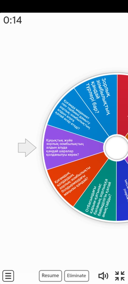 Зорлықтың қандай түрлері сендерге белгілі? (қара бұлттарға түрлерін жазып ілу). Осы ситуатциядан қалай шығар едіңіздер Физикалық зорлық (итеру, жұлмалау, алақанмен жұдырықпен немесе басқа да заттармен ұру, «Суреттер» сөйлейді Экономикалық (адамды заңмен көзделген құқығы бар тұрғын үйінен, тамағынан, киімінен, мүлкінен, қаражатынан қасақана айыру,) Сергіту сәті Word woll платформасы